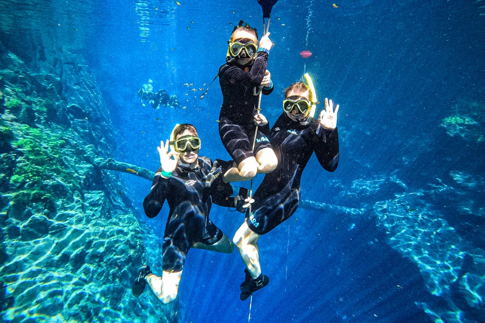 Na flutuação, os visitantes deslizam suavemente sobre a incrível lagoa, cercados por diferentes tons de azul, com uma visão impressionante para o abismo subaquático. Para quem opta pelo mergulho com cilindro, é possível explorar as profundezas com tranquilidade e segurança, sempre acompanhados por instrutores certificados.
